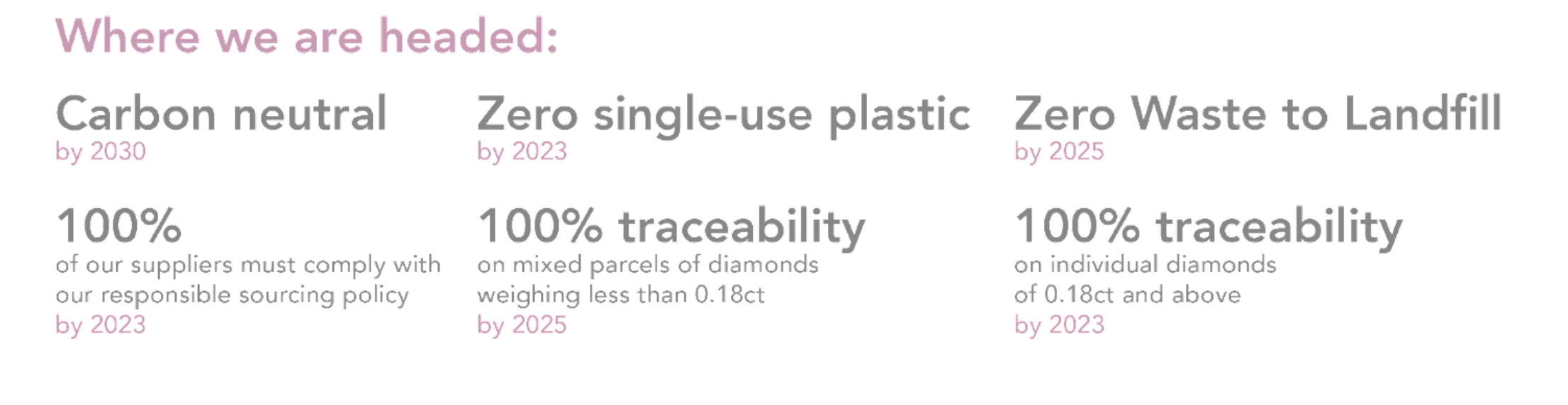 It is all here: from our carbon consumption to how we track our diamonds through the supply chain, and those all-important pledges for our future. This is Diamonds with Purpose.